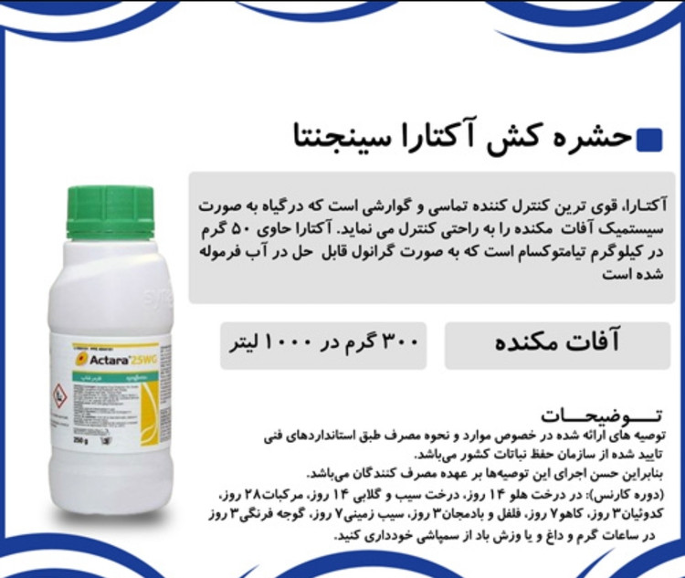 حشره کش آکتارا سینجنتا، حشره کش سیستمیک با خاصیت تماسی و گوارشی و حاوی 250 گرم ماده موثره تیامتوکسام در کیلوگرم است. حشره کش آکتارا سینجنتا دارای اثرات سوء روی دشمنان طبیعی میباشد. از این رو باید از سمپاشی درختان در مرحله گلدهی خودداری نمود. کاربرد این حشره کش فقط یک نوبت در سال به طور منطقی و در تناوب با سایر سموم با اثرات جانبی کمتر در زمان ایجاد کمترین تلفات روی دشمنان طبیعی توصیه میشود. سمپاشی باید زمانی صورت گیرد که احتمال تلفات دشمنان طبیعی در مرحله مقاوم کمتر است.