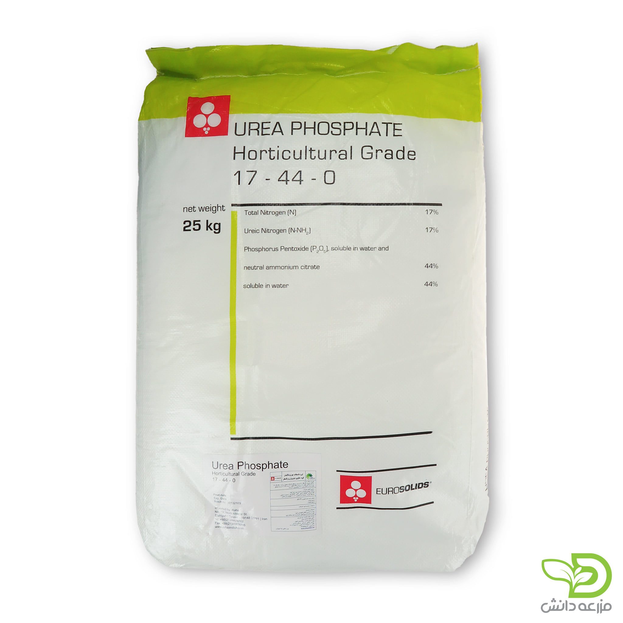کود اوره فسفات 17.44 یوروسالیدز دارای عناصر ازت و فسفر است. که مناسب برای مراحل رشد اولیه و رویشی گیاه میباشد. سطح بالای فسفات در فرمول اوره فسفات تقسیم سلولی و رشد بافت جدید گیاه را افزایش میدهد. اوره فسفات 17.44 بسیار خالص بوده و دارای خاصیت اسیدی میباشد. خاصیت اسیدی محصول ممکن است به کاهش بیکربناتهای موجود در آب کمک کند. در صورت وجود سختی آب مصرف آن ایده آل است. بنابراین باعث جذب فسفات توسط گیاه میشود. فلزات سنگین، سدیم و کلر در اوره فسفات بسیار ناچیزاند. این ترکیب به سرعت و به طور کامل در آب حل میشود. این کود ماکرو هم به صورت آبیاری و هم محلولپاشی قابلیت مصرف دارد.